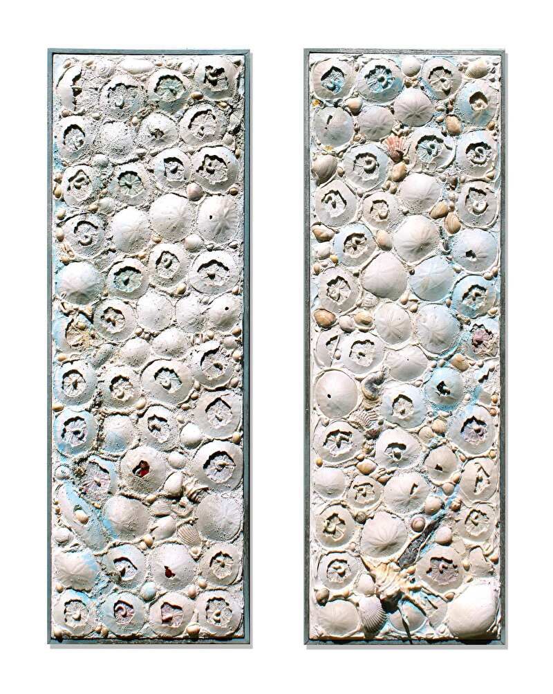 In my sand dollar mosaics, I use sand dollars that the gulls have eaten as an environmental symbol of the decline in food for the birds and the need to care for the sea.